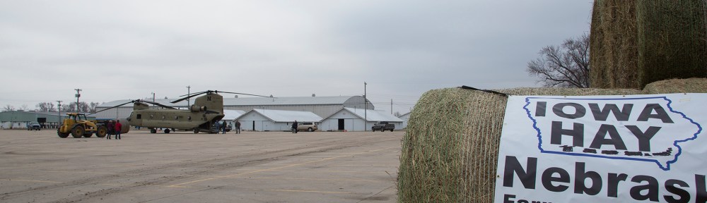 As we watched the Nebraska Air National Guard load four round bales to feed stranded cattle owned by Drew Wolf of Richland, Nebraska, we met Jay and Kim Schilling from the southwest corner of the state. They had just brought in 23 round bales, and while some of it was being loaded for airlift, two more semi’s showed up with needed hay and corn fodder from Iowa.