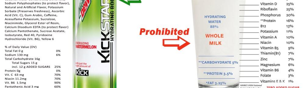 Legislators were surprised to learn that high school students can’t buy whole milk but they can buy Mountain Dew Kickstart at school. This 80-calorie beverage made by PepsiCo — the company that also created a Smart Snacks website for school foodservice directors and received the GENYOUth Vanguard Award last November — is deemed “okay” by the current USDA Dietary Guidelines because it has fewer calories than milk, zero fat and a list of added, not natural, vitamins and minerals. But it also has 20 grams of carbohydrate, 19 grams of sugar in the form of high fructose corn syrup and zero protein, whereas whole milk has 12 grams of natural carbohydrate and 8 grams of protein.