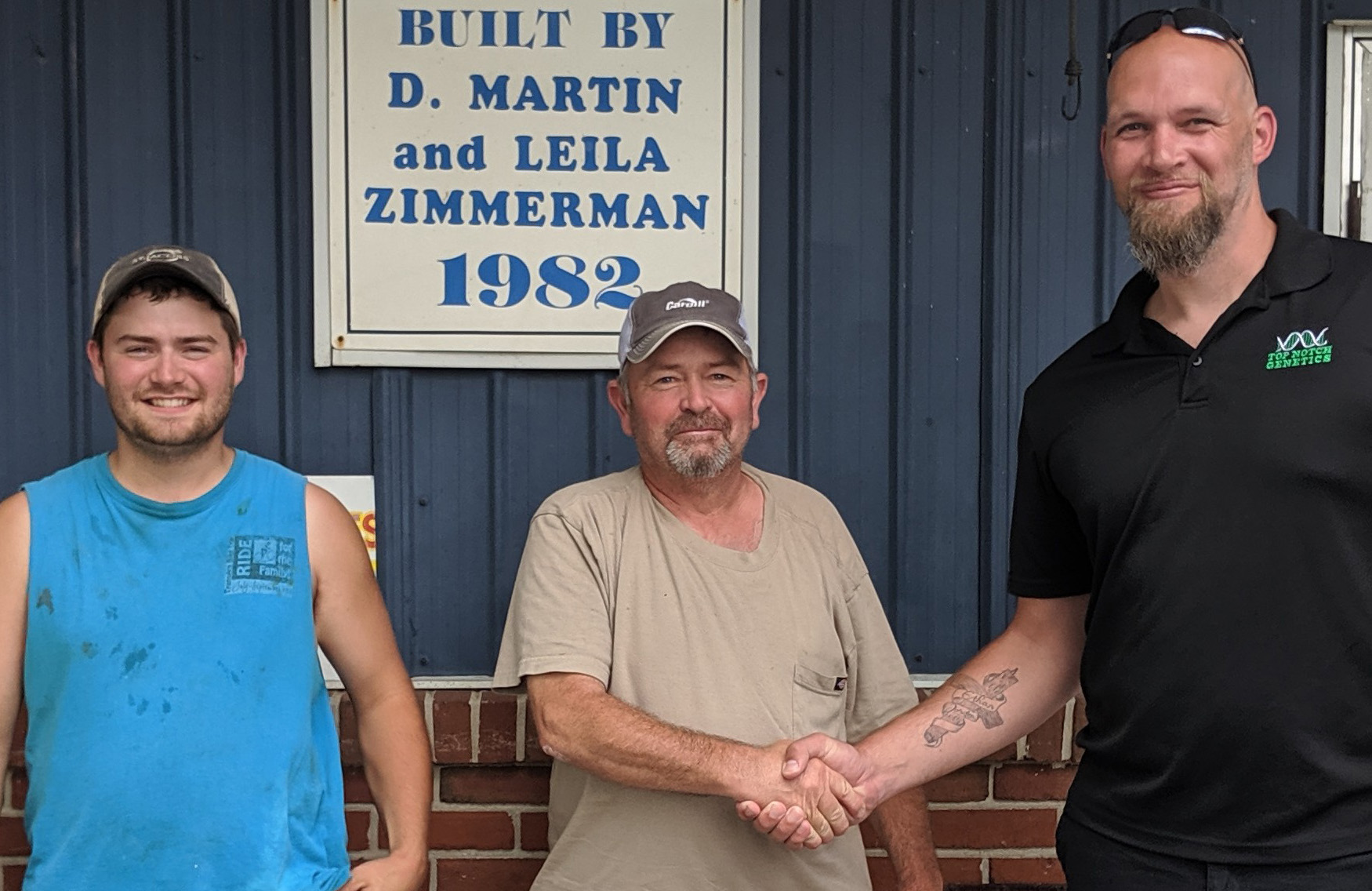 Brandon DeLong (right) of Top Notch Genetics congratulates Jordan (left) and Dale Zimmerman as the first to purchase straws of Dynamite to light the Dina fuse at Misty Z Holsteins, East Earl, Pa. Photo submitted