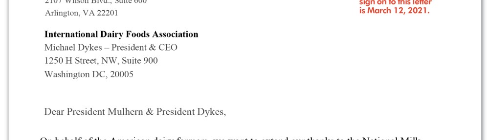 Dairy producers and dairy advocacy trade associations are invited to add their names as signatories to this letter to the presidents of both NMPF and IDFA. Hundreds of producers and dairy trade associations have done so electronically within the first few days.