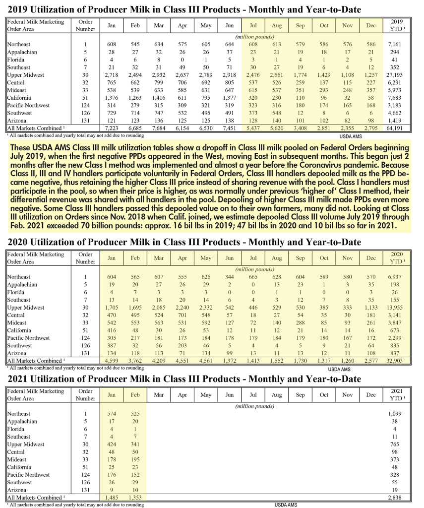 Moving milk to Class I may be more of a discussion for the high fluid utilization areas of the Southeast, where producers end up indirectly ‘paying’ to bring milk in during deficient times of the year. This can be costly when there are price gaps and inversions as documented in the fall months of both 2019 and 2020.