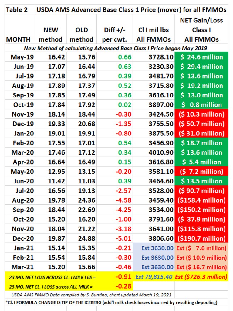 In the three fat/skim pricing FMMOs of the Southeast U.S. where PPDs are not shown, Calvin Covington calculates dairy farmers in FMMO 5, 6 and 7 collectively had net loss of $1/cwt off the blend price for 23 months due to the mover change from higher of to average-plus.