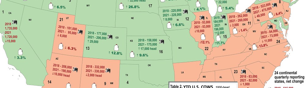 In the Southern Plains, where joint-venture processing capacity continues to grow, Texas has continued full-steam-ahead, gaining 87,000 cows from 2018 to 2021, along with 29,000 added in Colorado and 17,000 in Kansas. New Mexico regained earlier losses to be 2000-head shy of 2018.