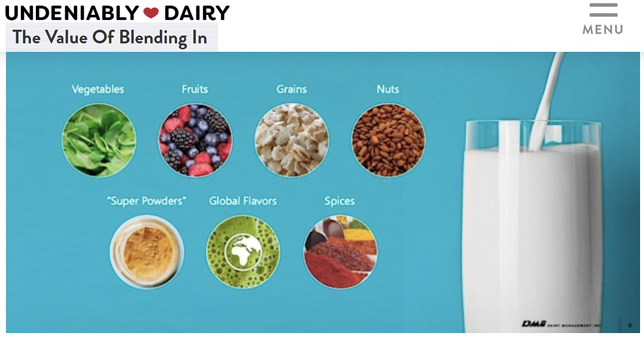 (Author’s note: Who is promoting milk’s natural healthy halo? The vitamins, minerals, high quality protein, hydrating water, electrolytes, healthy matrix of fats, important fatty acids, essential nutrients of concern in today’s diets, and more? Does dairy suddenly need other ingredients to improve its health halo, according to DMI consumer research? Because consumers do not know much about the health and nutrition of real milk and dairy, blending is the answer?)
