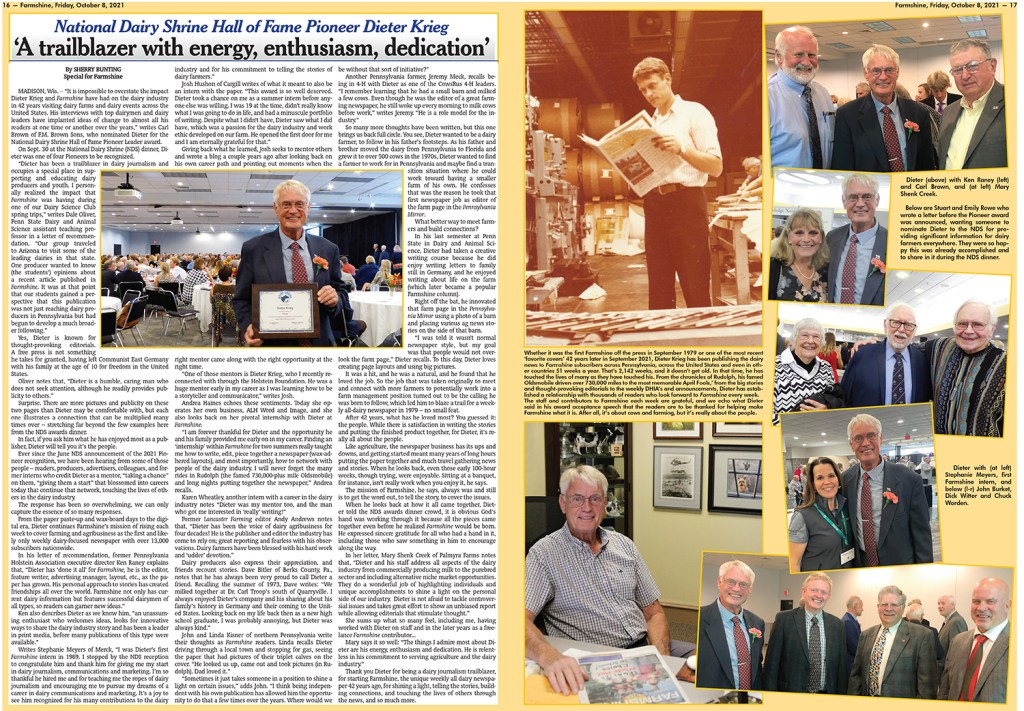 “Dieter has been a trailblazer in dairy journalism and occupies a special place in supporting and educating dairy producers and youth. I personally realized the impact that Farmshine was having during one of our Dairy Science Club spring trips,” writes Dale Olver, Penn State Dairy and Animal Science assistant teaching professor in a letter of recommendation.