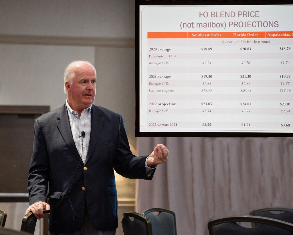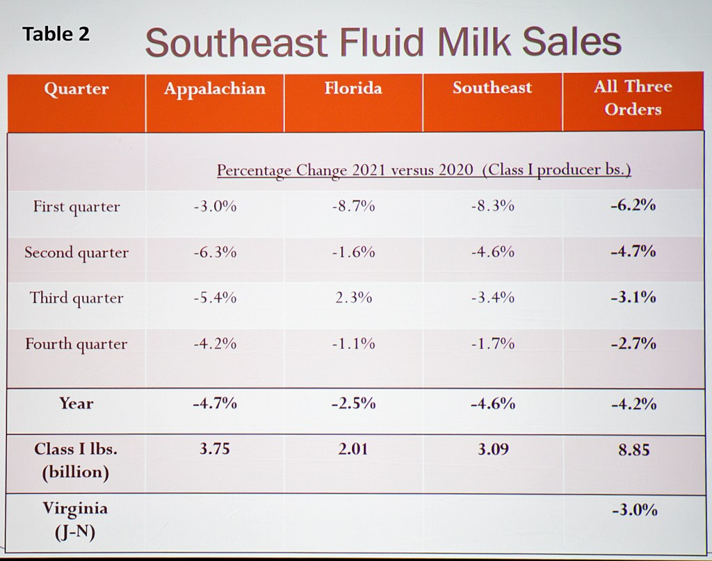 In the Southeast milkshed among major milk producing states, Florida’s average number of herds was 75 in 2021, down 10 from 2020 (11.8% drop); Georgia 110, down 20 (15.4% drop). Production and cow numbers were mixed with Georgia growing output by 1.4% in 2021 vs. 2020 with 1000 additional cows; Florida’s production declined 5.1% with 5000 fewer cows, and Virginia’s production was down 3.4% with 2000 fewer cows.