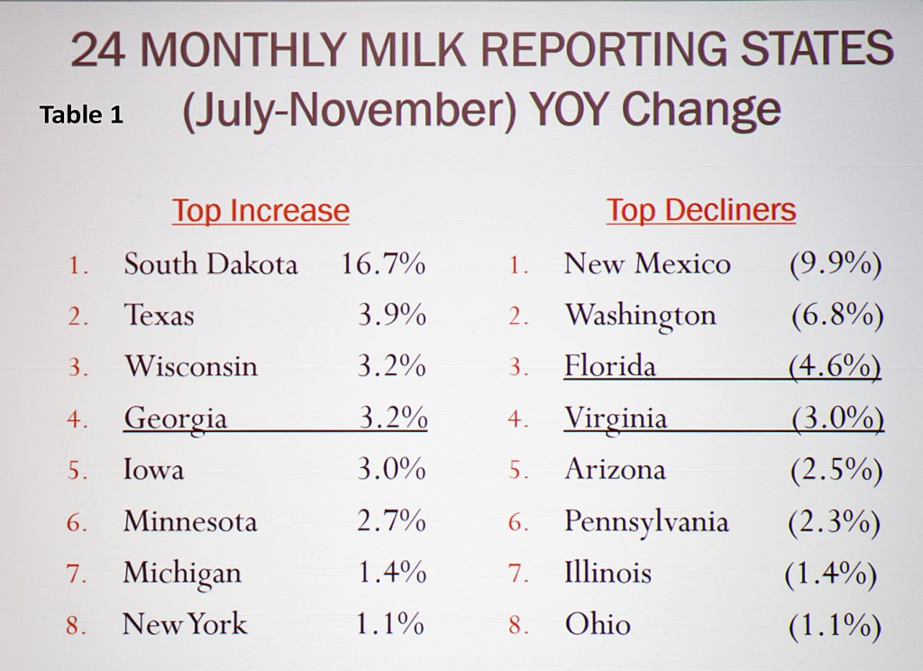 Four other states gained production in January vs. year ago, (in addition to Georgia). They were: Iowa, up 1.7% with 3000 more cows vs. year ago; Idaho up 0.6% with 4000 more cows, Texas up 3.5% with 12,000 more cows, and South Dakota up a whopping 18.3% with 28,000 more cows.