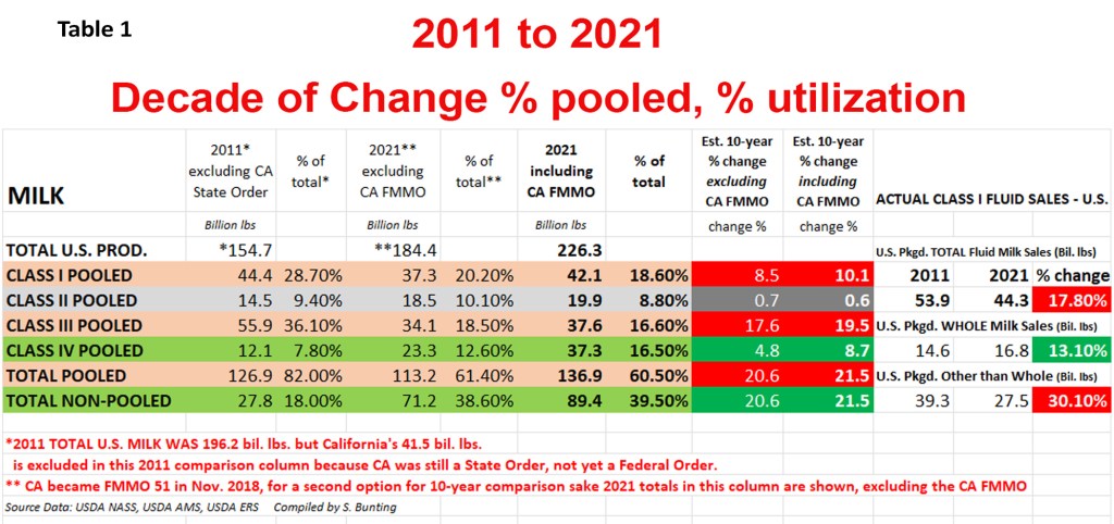 As the percentage of Class I sales have declined in relation to growth of U.S. milk production over the past decade, the percentage of milk pooled on FMMOs has also declined from 82% in 2011 to 60% in 2021 (See Table I).