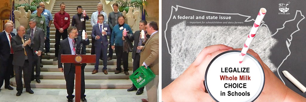 Then, in 2012, the Obama-Vilsack USDA promulgated rules to outright ban whole and 2% reduced-fat unflavored and flavored milk as well as 1% low-fat flavored milk as “competing beverages” across all schools. USDA documents note that this move was based on information from an industry school wellness program that had touted three-a-day fat-free and low-fat dairy, reporting those schools that had voluntarily restricted the higher fat milk options were doing better in meeting the constraints of the Dietary Guidelines.