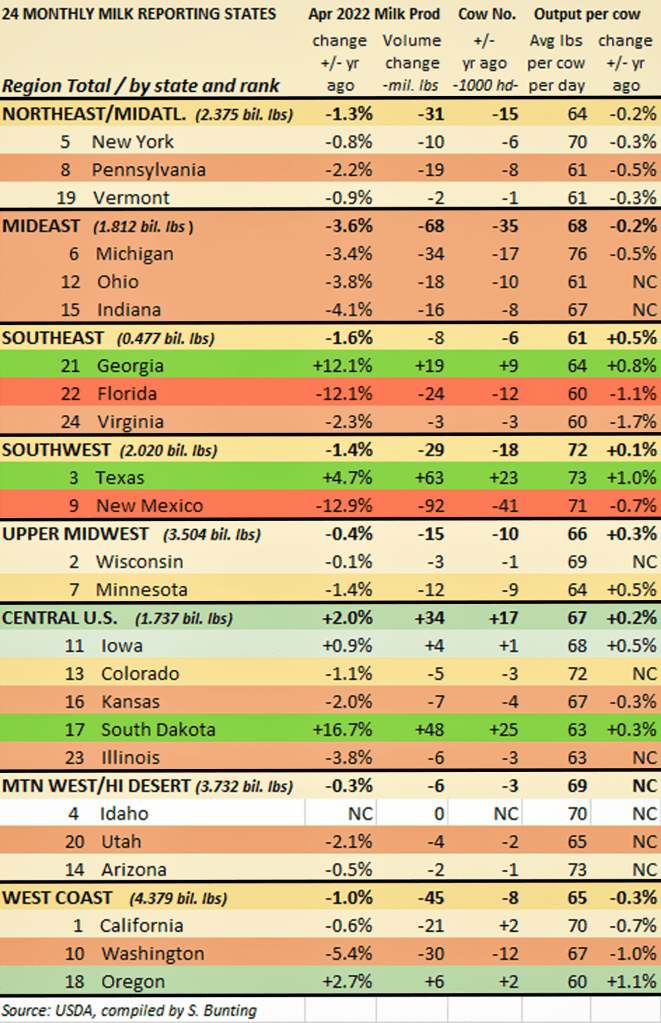 In the Upper Midwest, No. 2 Wisconsin was almost steady as production was down just 0.1% with 1,000 fewer cows in April, while No. 7 Minnesota milked 9,000 fewer cows and made 1.4% less milk than a year ago in April.