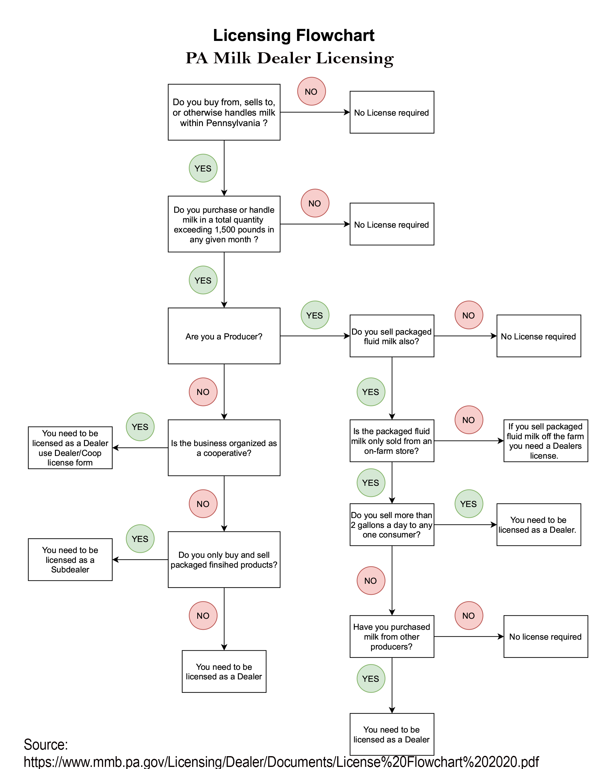 “There was no flow chart to determine if we needed to do this (like is shown below at PMMB website: https://www.mmb.pa.gov/Licensing/Dealer/Documents/License%20Flowchart%202020.pdf). My wife emailed back wanting to know why this pertained to us,” said Aaron Simpson of Lone Oak Farm in an Aug. 17 phone interview with Farmshine. “We were told it pertains to us because we were selling a small amount of milk off site at Back to Nature,” a health store in Indiana, Pennsylvania.
