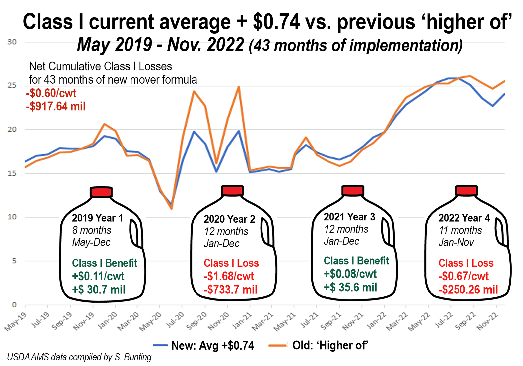 The recommendation to return to the higher of Class I mover is an important response by NMPF to dairy farmer concerns. That ball has been in USDA’s court after the first two years of implementation, according to the farm bill language that changed it to an averaging method in the first place. Four years and nearly $1 billion in cumulative Class I net value losses have passed (see chart), but Ag Secretary Tom Vilsack said he needed to see “consensus” before allowing a hearing to be opened.