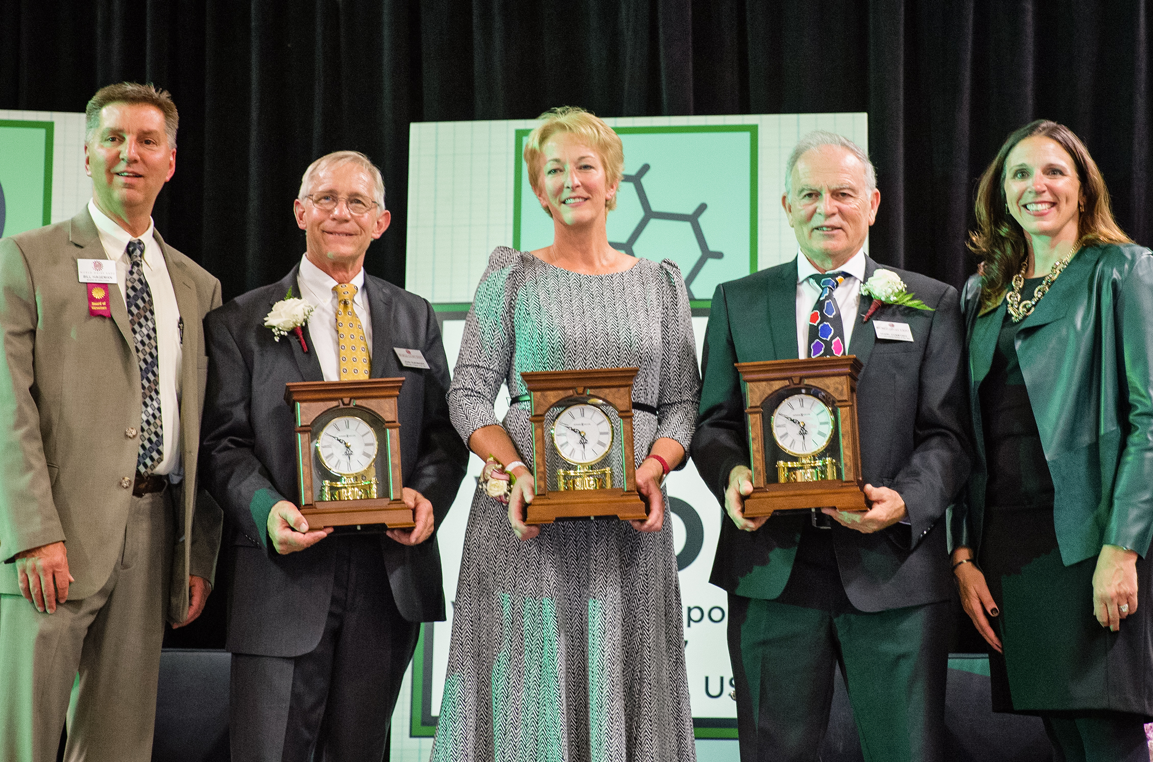 World Dairy Expo award recipients were honored at the Dinner with the Stars, (l-r) Expo Board President Bill Hageman, Producer of the Year John Ruedinger, Industry Person of the Year Shelly Mayer, International Person of the Year Mark Comfort, and Expo General Manager Laura Herschleb.