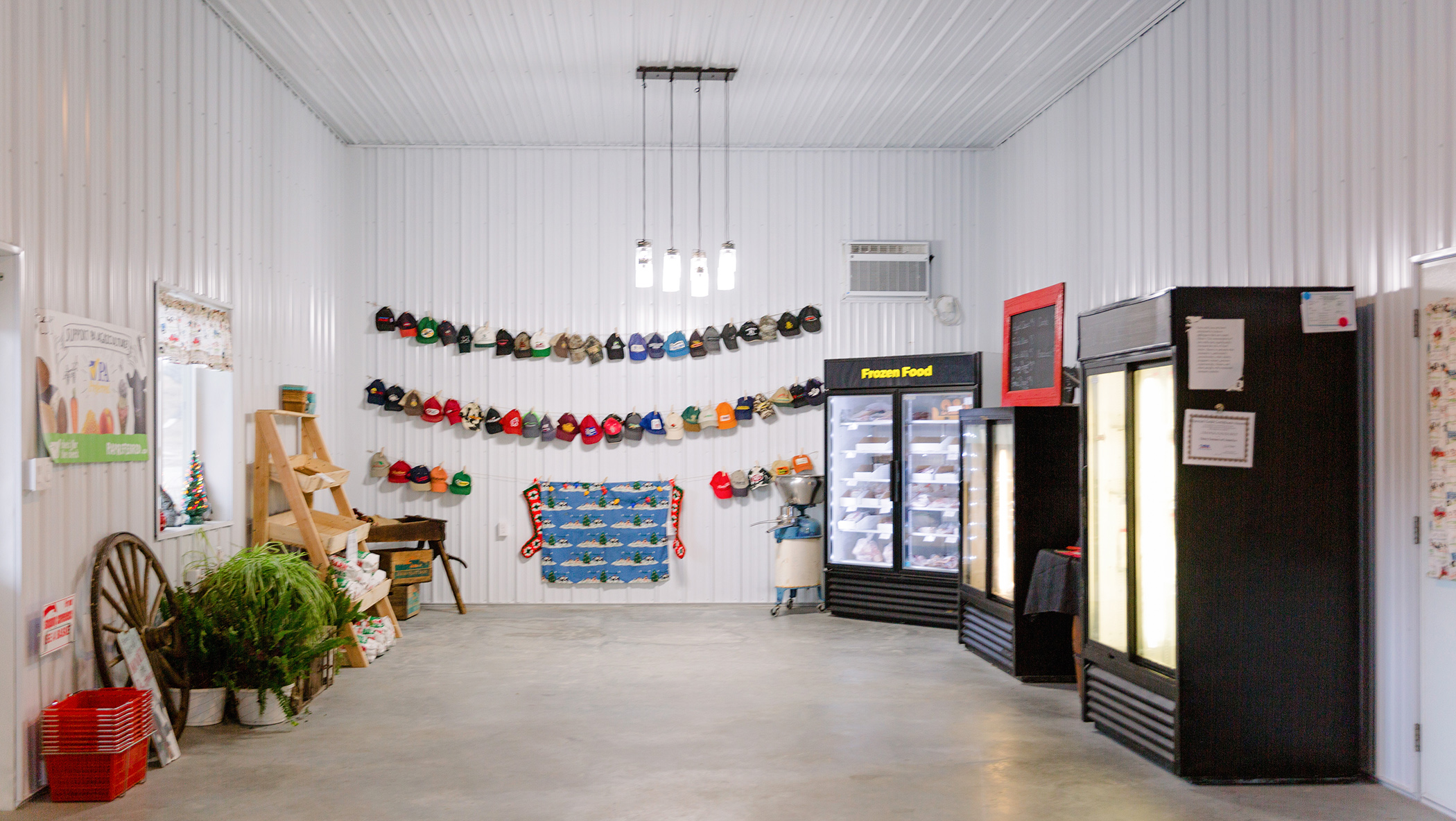 While grandfather David helped with the electrical work and mapping out the flow in processing, storage and retail, grandmother Gloria painted country art for the vintage displays of old farm and dairy equipment interspersed between coolers — giving the space that country store feel.