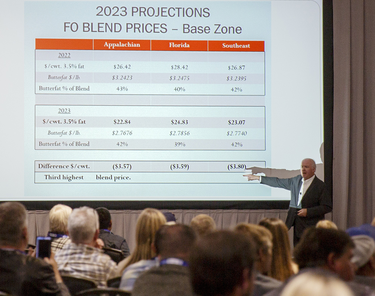 SAVANNAH, Ga. — In a much anticipated market outlook with its full complement of charts and graphs, retired milk co-op executive Calvin Covington told the crowd of 500 attending the mid-January Georgia Dairy Conference in Savannah that 2022’s record-high blend prices outpaced his earlier projections, and he sees the pressure in 2023 coming more from the demand side than the supply side.