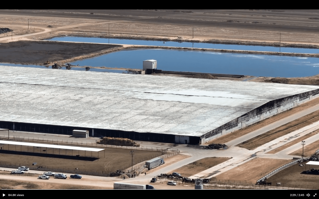 This still frame from drone footage of the 2,136,973 square-foot facility at South Fork Dairy shows the fire damage involved the entire roof of the cross-ventilated building. The Texas State Fire Marshal’s office is calling it accidental, indicating machinery malfunction as the cause and further investigation continuing. One employee remains hospitalized and 18,000 dairy cows are dead. Photo captured from drone video courtesy Blake Bednarz, West Texas Tech