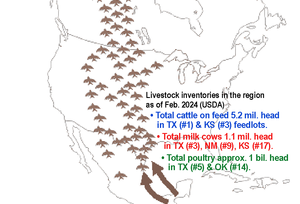 The region’s milk cows are most concentrated in and around the Panhandle of the No. 3 dairy state of Texas, No. 9 New Mexico and No. 17 Kansas portions of the Central Flyway for ‘migratory wild birds.’