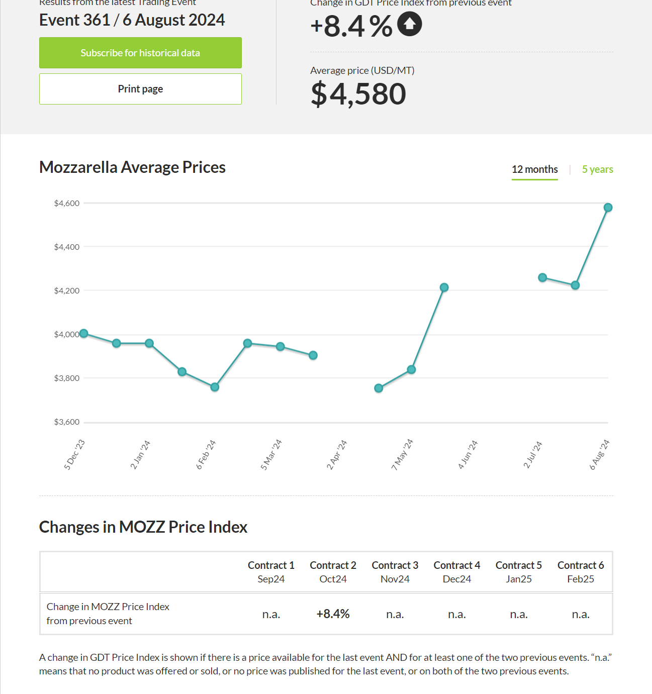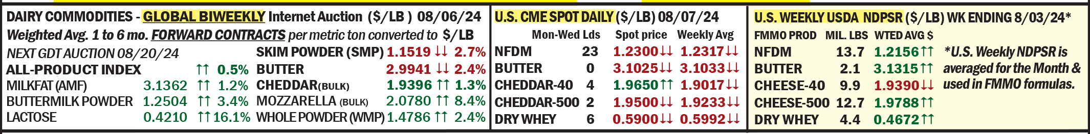 The big story is bulk mozzarella was up a record 8.4% with all sales contracted for delivery October 2024. The bulk mozzarella contracts are new. They have only been trading on the GDT since December 2023. Tuesday’s sales — all for Oct. 2024 delivery — are, by far, the highest yet of the 15 sessions in which bulk mozzarella was offered. The CME does not have a U.S. ‘clearing market’ for mozzarella. Furthermore, USDA does not include bulk mozzarella in the mandatory NDPSR weekly survey because mozzarella prices are not used in the FMMO milk pricing formulas. A proposal to add this was rejected by USDA in its recommended decision July 1st.