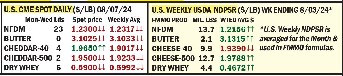 Grade A nonfat dry milk trade remained active the first three days this week with a whopping 23 loads changing hands, and the spot price pegged at $1.23/lb Wed., Aug. 7, down a penny and a half from the prior Wednesday. The weighted average for stood at $1.2317, and the NDPSR price continued to lag the past few weeks of spot market levels by three cents.