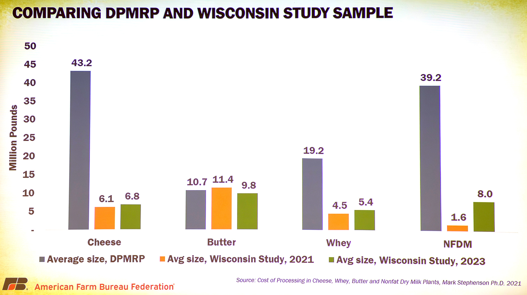 New to the discussion was make allowance data compiled by AFBF for its official comment at the Federal Register showing the average plant size of processors participating voluntarily in the Stephenson Survey relative to the average plant size of processors reporting to the NASS Dairy Product Manufacturing Survey (below)