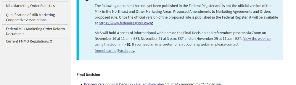 The broad range of changes in the proposed final rule are the result of the national hearing and rulemaking process that began in 2023. It will be made final for implementation after dairy producers vote to approve these changes in the Order-by-Order referendum that will be completed before the new administration takes office on January 20th.