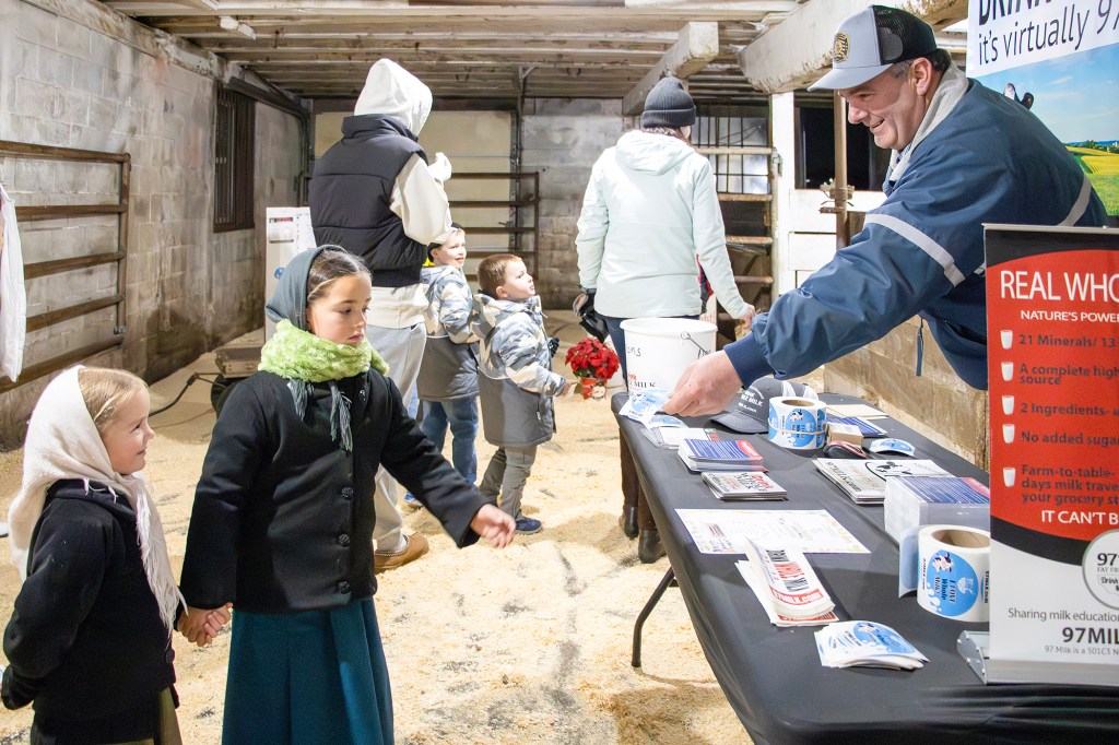 RONKS, Pa. – What better place to be on a chilly evening 12 days before Christmas than in a stable with cows as a family goes about their evening milking and feeding? How fitting to remind the public not just about where their milk comes from, but also the way the Lord Jesus entered this world as a baby, wrapped in a manger, in a stable, with cattle lowing His lullaby.