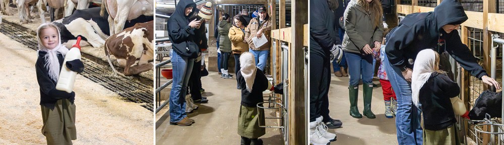 The whole event is a leisurely walk around the barn during chore time, culminating at a table with whole milk, chocolate milk and homemade Christmas cookies.