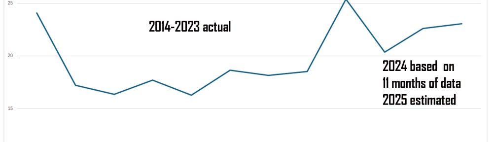 Despite the positive supply and demand fundamentals, we saw fourth quarter 2024 milk prices decline $1 to $1.50 from the year’s high point at $25.50 in September, and even though dairy products are holding steady on the CME spot cash markets, the CME milk futures markets took a tumble into below-$20 territory across the board this third week of the New Year.