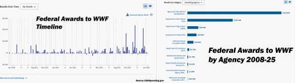 Of the over $500M, USAID awarded WWF $310M; the Department of Interior awarded WWF $149M; and USDA awarded WWF $36M, with other federal agencies rounding out the total. ($500M is a large sum that the mainstream media refer to as “merely a rounding error” next to the $36T (trillion) in national debt, but where else do these layers lead in terms of money and policy?)