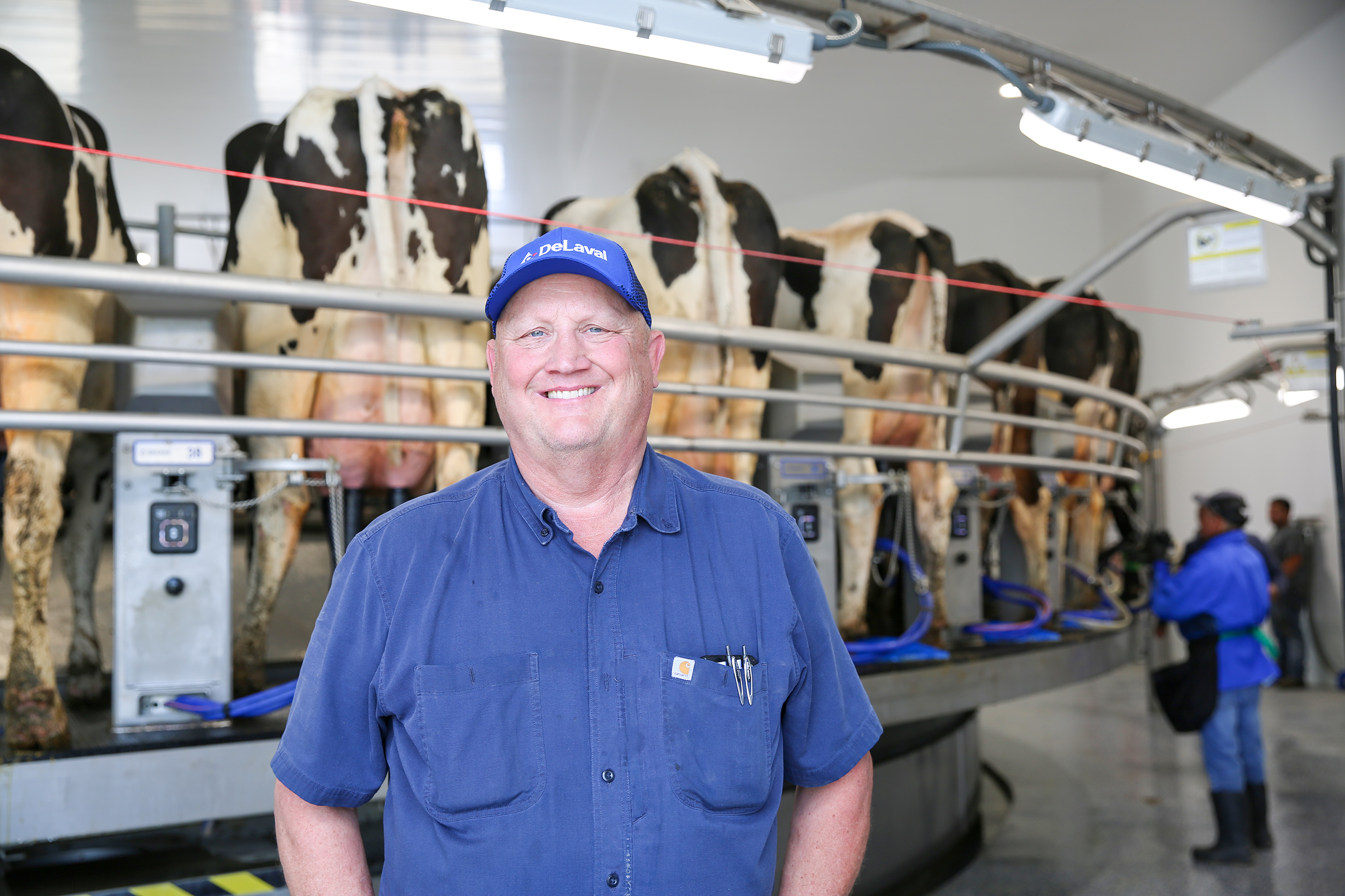 With the automated pre- and post-dipper, Waybright says the milking procedure in the DeLaval 50-stall rotary is very consistent, requiring just two employees, the first to wipe and forestrip and the second to dry and attach.