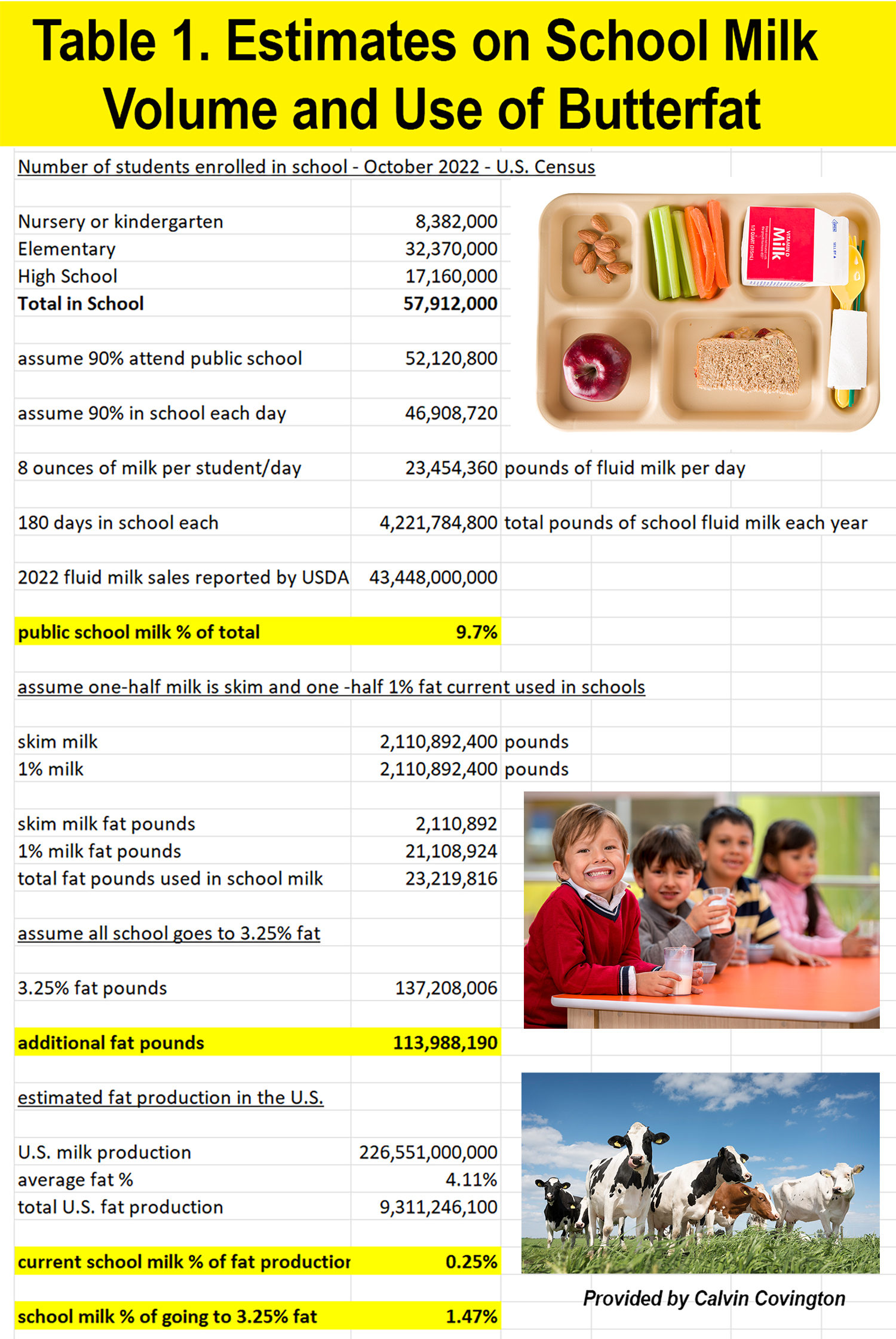 “Increased Cheddar cheese production has used millions and millions of pounds of butterfat. No one complains about this. Doesn’t the dairy industry want to increase demand for all milk components?” he replied and sent forth his own calculations, providing a spreadsheet showing his estimates of milk used in schools and the additional fat that would be needed for all of that milk to go completely to 3.25% (whole) milk.