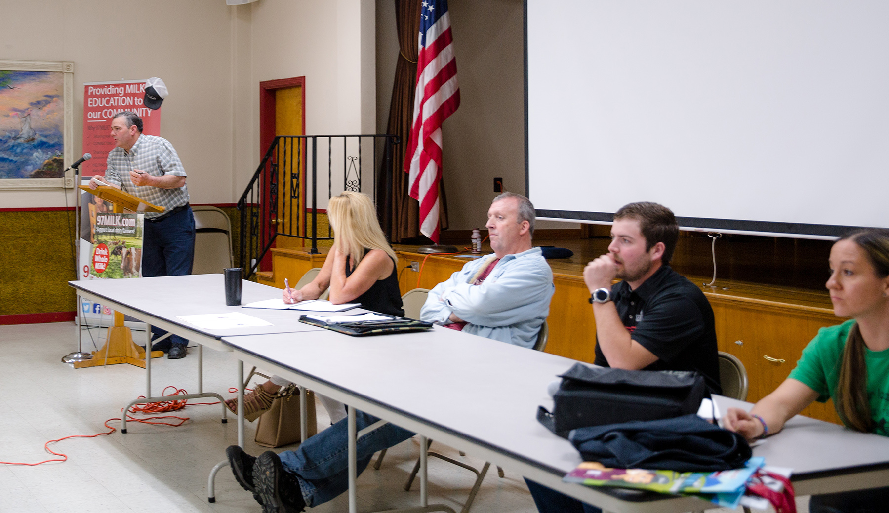 GN Hursh, a Lancaster County dairy farmer and 97 Milk chairman, thanked everyone for doing their part to educate and promote whole milk. Referring to Berks County dairy farmer Nelson Troutman as “the seed” of the 97 Milk movement painting the first round bales with Drink Whole Milk 97% Fat Free, he asked Troutman to introduce the Congressman during the meeting — an honor Troutman put in the way only he can: “I never thought I would be introducing the Ranking Member of the House Ag Committee in ‘downtown’ Mt. Airy.”