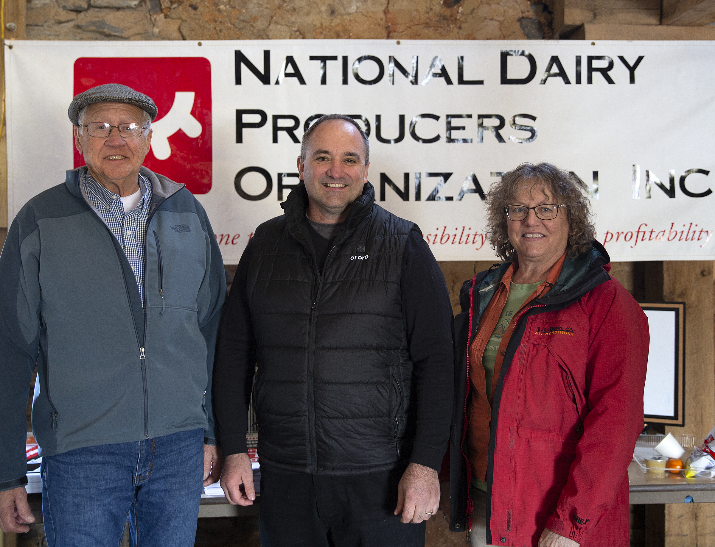 Traveling from Michigan to the Lancaster County, Pennsylvania farm of Mike Eby (center) for an ’empowering’ farmers meeting were Joe Arens (left), NDPO board member and Kristine Ranger, a knowledge consultant working with farms. Ranger worked with Eby to secure a grant for the in-person meeting and multi-media production. In addition to serving as NDPO (National Dairy Producers Organization) chairman, Eby is executive director of Organization for Competitive Markets (OCM), represents the south district on the PA Farmers Union board and is a member of the Grassroots PA Dairy Advisory Committee collaborating with 97 Milk education efforts.