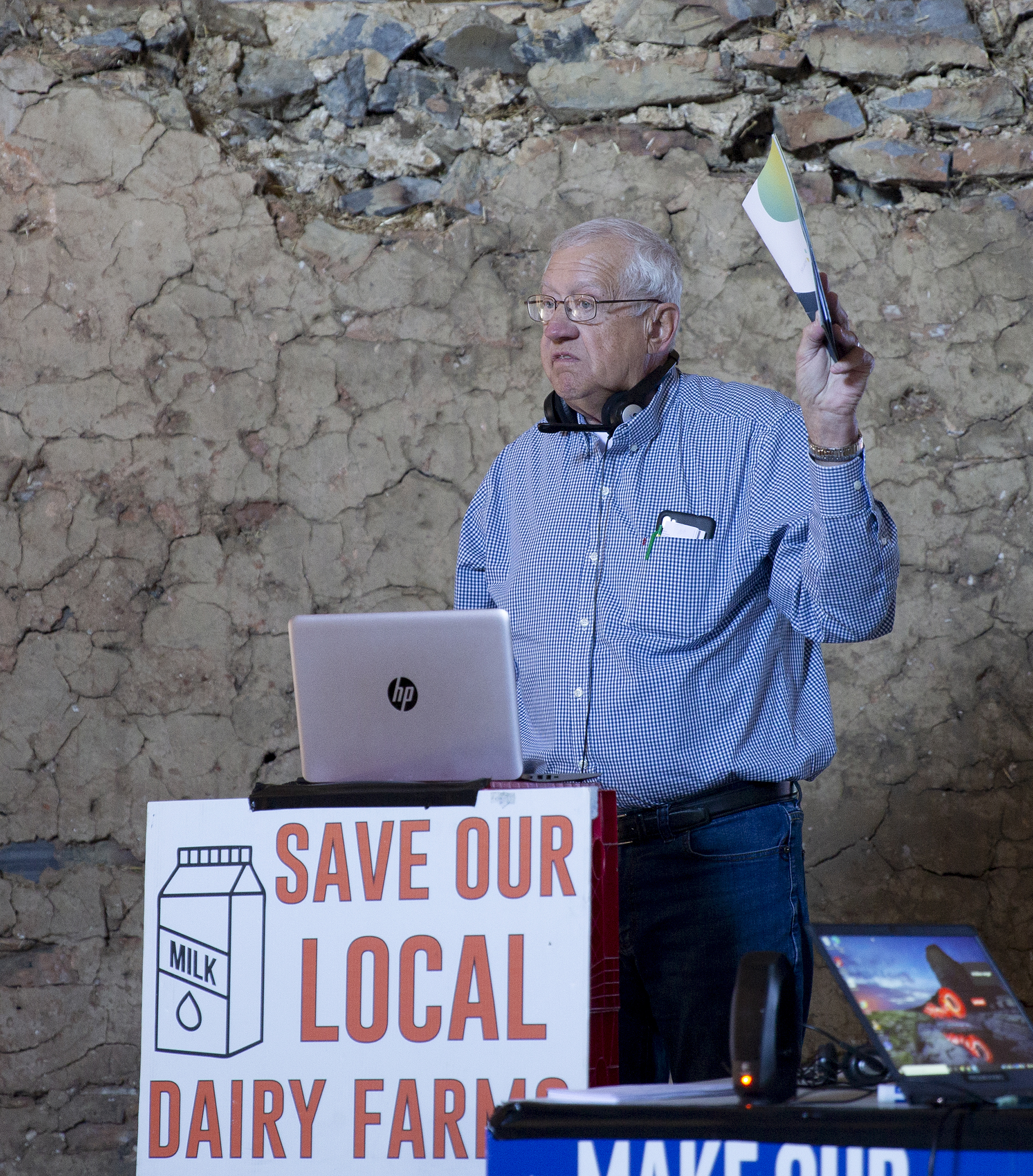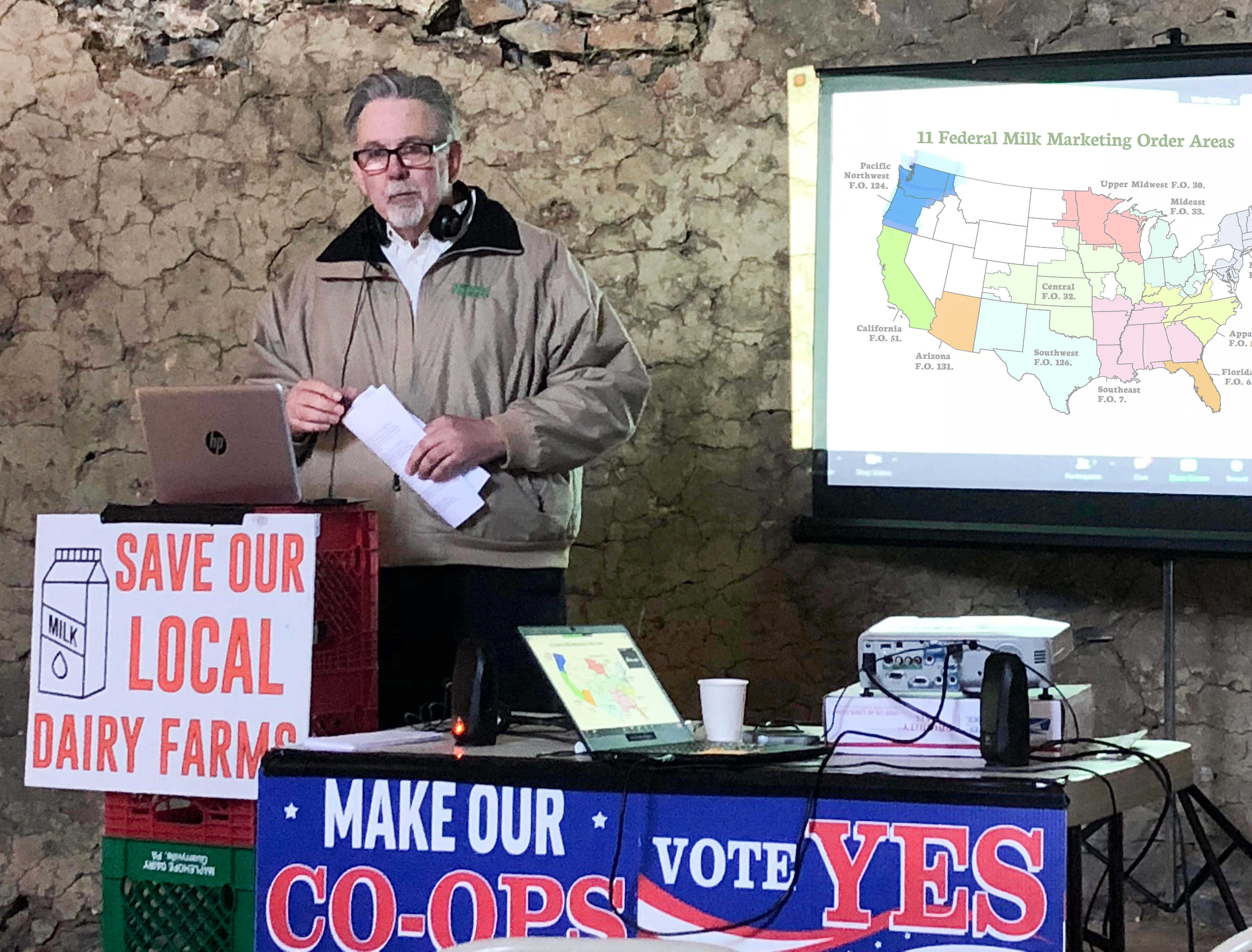 Dick Bylsma of National Farmers Organization (NFO) traveled from Indiana to brief producers on joint efforts between NFO, Farmers Union and Farm Bureau to empower dairy farmers by getting their individual votes back in Federal Order hearings. He traced the history of Federal Milk Marketing Orders, and the genesis of bloc voting at a time in history when there were hundreds of thousands of farmers and communication was slow.