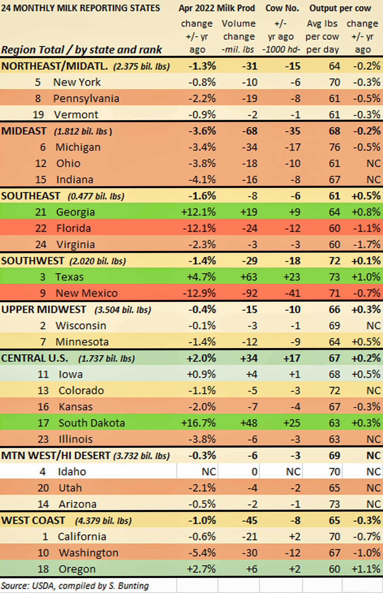 In the East, No. 4 New York increased production 1.3% with no added cows. No. 8 Pennsylvania as well as Virginia had milk production equal to a year ago, and both milked 1000 fewer cows. Vermont’s output grew 0.5% with 2000 fewer cows. Georgia grew by 4.1%, without adding cows. Florida declined 3.6% with 5000 fewer cows.