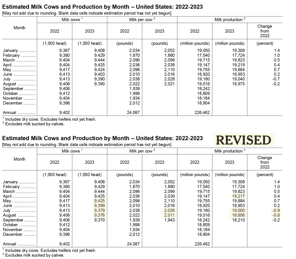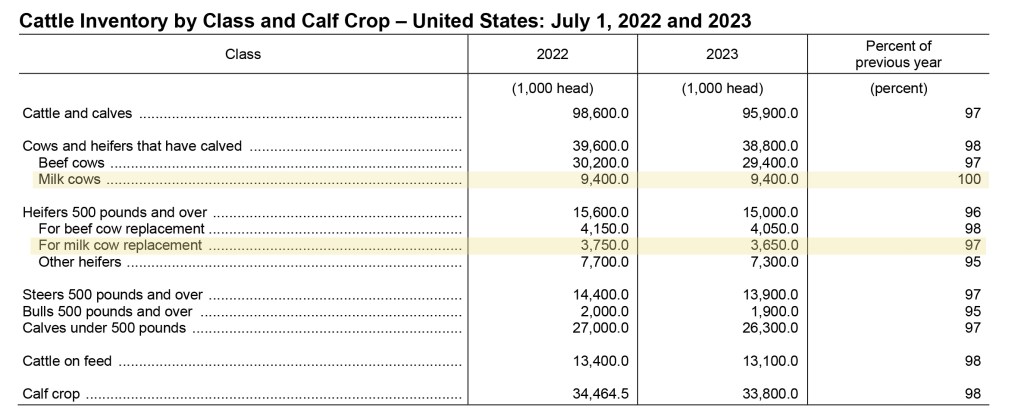 No. 3 Texas added 45,000 head, with milk up 9.4% YoY. For the first time in 4 years of major losses in production and cow numbers, neighboring New Mexico reported 2000 more cows making 1.5% more milk. South Dakota added 9000 cows and 5.1% more milk. No. 4 Idaho milked 29,000 more cows making 4.3% more milk. Kansas added 8000 cows with 4.4% more milk. No. 1 California continued lagging, down 2.1% as bird flu continues, though it is diminishing. No. 2 Wisconsin was up 0.1%, with 5,000 fewer cows. In the Mideast, 2000 more cows were milked, collectively, with Michigan’s milk up 1.3%, while Indiana and Ohio both gained 0.8%.