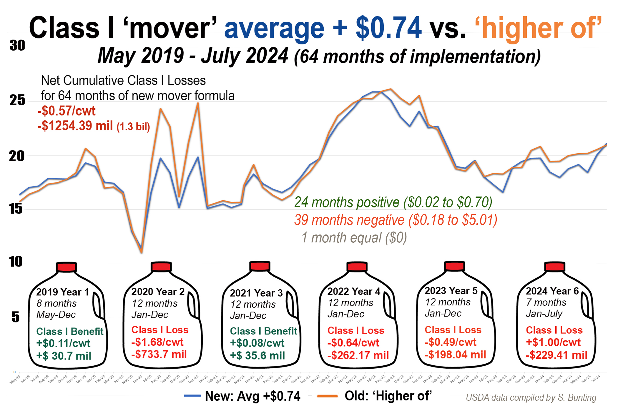 Farmshine’s Market Moos columnist Sherry Bunting has updated the graph showing how the supposedly revenue-neutral change from the ‘higher of’ to an averaging formula for the Class I mover May 2019 through March 2024 will have reduced Class I value in farm milk checks over 59 months of implementation. This graph of cumulative and year-to-year losses does not include additional losses many farmers have incurred when manufacturing class milk is out of alignment with Class I, and is depooled, with the revenue excluded from the FMMO pools and benchmarks.