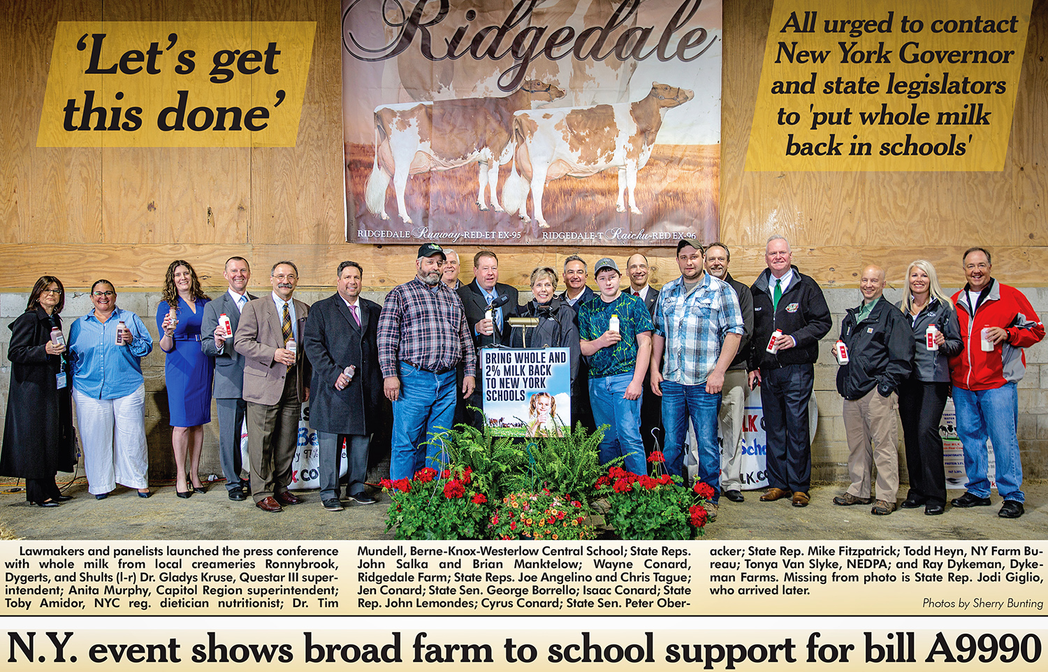 SHARON SPRINGS, N.Y. — It was a rainy, dreary Monday (May 2), but dairy nutrition advocacy was bright and sunny in the feed room at Ridgedale Farm. The Conard family hosted a press conference supporting New York State legislation to bring whole and 2% milk back to schools.