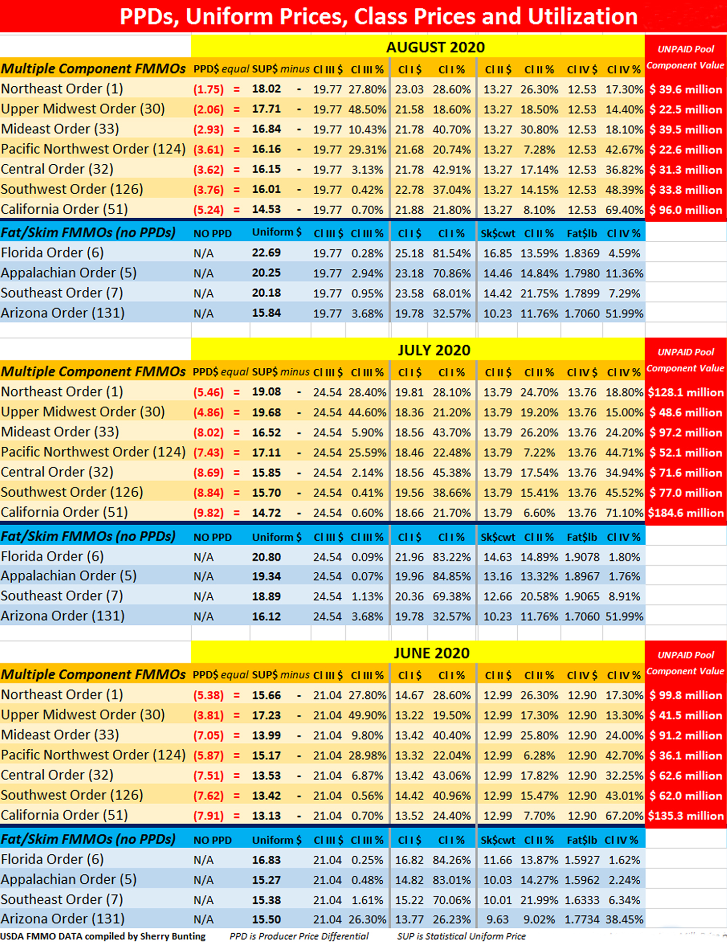 Table 1 (above) shows the “other use / milk dumpage” pooling data. What is mind-boggling is that year-to-date milk dumped totals at 566.7 million pounds for just the first 6 months of 2020, is 125 to 150 million pounds greater than the 12-month annual totals for each of the past five years.