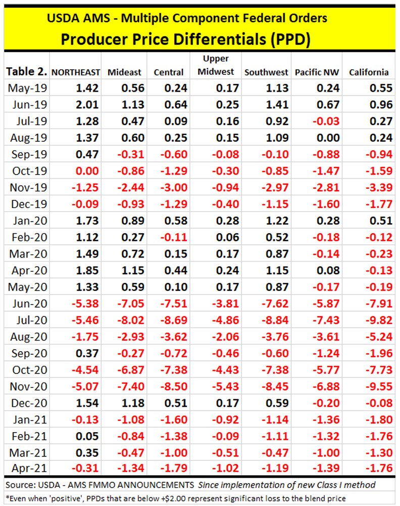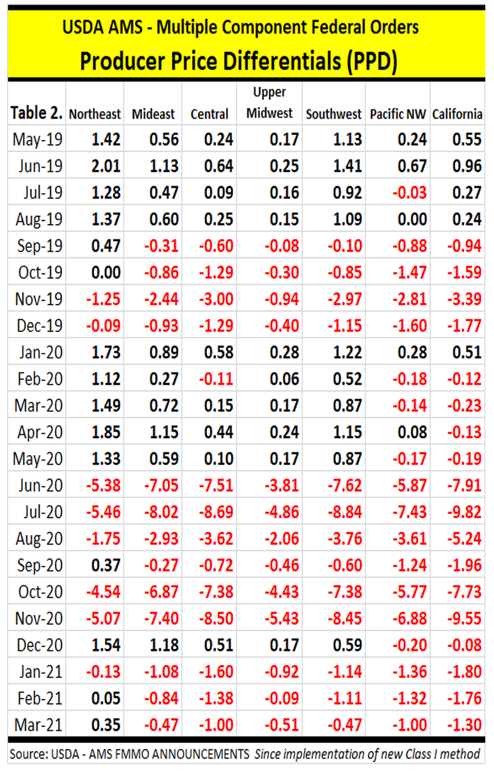 The depooling of Class III milk and the negative PPDs (above) began on the West Coast in July 2019. By September through December 2019, all multiple component FMMOs had negative PPDs, that became more negative as volumes of depooled milk were noted in the central part of the country, moving east.