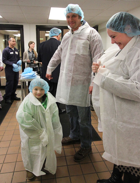 Owen Trissel is “over-the-moon” with excitement as he suits-up for the plant tour with his parents Cory and Charity. Owen, 9, and his brother Ian, 4, are the stars of the 2% milk label. One of the features of the Shenandoah Family Farms brand is to engage consumers in farm life through brilliant photography and larger labels. Photo by Sherry Bunting