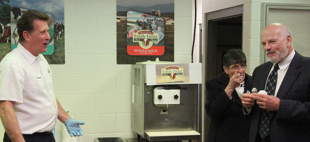 Charles Evans is the ice cream lead for Shenandoah Family Farms. He served the soft-style ice cream to local officials and media Tuesday. (I must say it was tasty!) Photo by Sherry Bunting