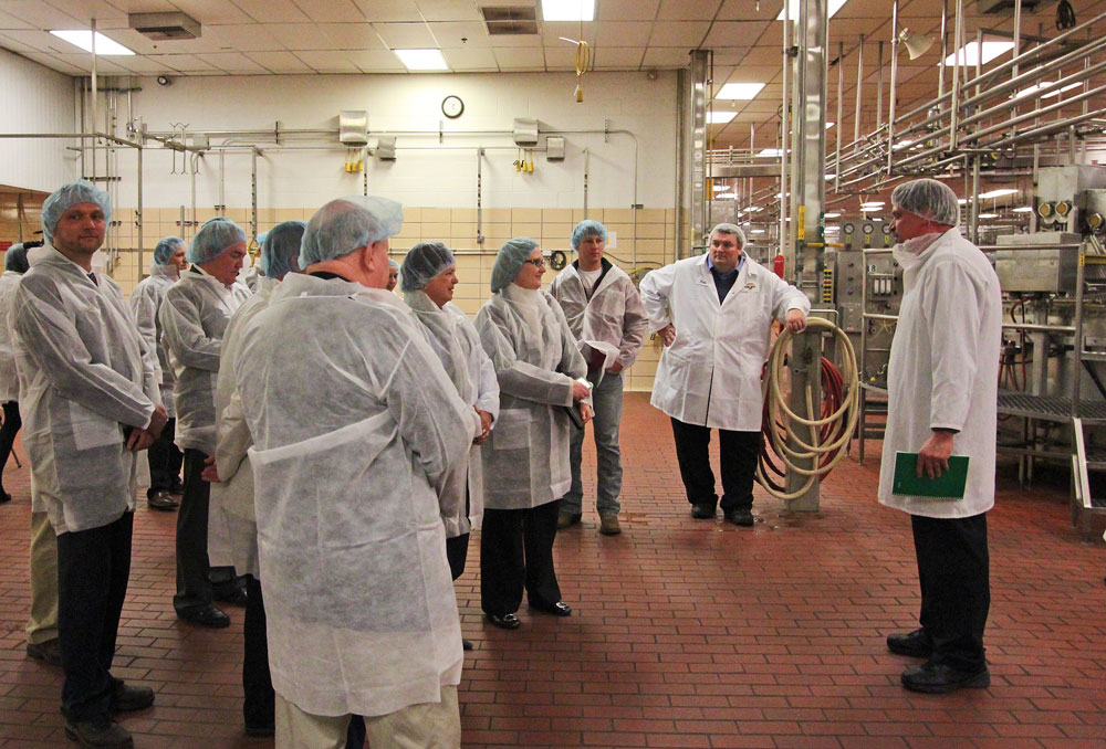 Hagerstown Mayor Dave Gysberts and Council member Don Munson were among the 35 suiting-up for Tuesday’s tour of the Shenandoah Family Farms dairy manufacturing facility. They are all smiles as 44 jobs have returned to the site of the former Unilever ice cream plant that once employed 400 people. Now owned and renovated by 21 dairy producers from northern Virginia, the plant began bottling milk last month, started making soft-serve ice cream mix this week and will be ramping up hard ice cream production as early as mid-April. Photo courtesy of the City of Hagerstown.