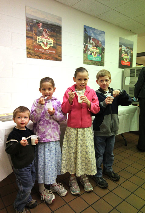Micah Showalter, 2, is tasting Shenandoah Family Farms soft serve ice cream with brother Adrian, 8, and sisters Emily, 9, and Erica, 6. Micah and his puppy are the stars of the Shenandoah Family Farms Whole Chocolate Milk label, shown here in poster size (left) on the wall above him, and all four children with a newborn calf at the Showalter family’s Sun Dial Farm-2 are subjects of the Whole Milk label, shown here in poster-size above them (right). The Showalters are among the 21 farmers in a 10 mile radius of Harrisonburg, Virginia, who purchased and renovated the former Unilever ice cream plant in Hagerstown, Maryland. They started bottling Shenandoah Family Farms Brand fluid milk and cream products at the plant on February 24. They began making vanilla soft serve ice cream mix this week and will soon be doing chocolate. Hard ice cream production begins in April with vanilla, chocolate and strawberry and will expand to 11 flavors over the next several months. Photo by Sherry Bunting