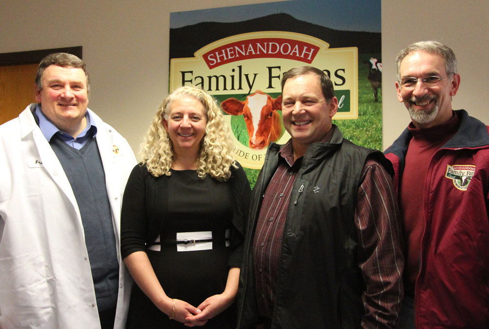 Dairy producers Dennis Trissel (right) and Randy Inman are two of the original five who met in 2012 at the Thomas House restaurant, Harrisonburg, Va., forming Shenandoah Family Farms Cooperative and planting the idea-seed for taking their milk straight from farms to consumers. They are pictured with Shenandoah Family Farms marketing director Jennifer Churchman who says “engagement marketing” is the hallmark of their campaign and plant manager Fred Rodes (left), who grew up on a dairy farm, then spent the past 25 years on the other side of the fence in the creamery world. He loves working with people, building teams, tackling challenges and tinkering with ice cream recipes. Photo by Sherry Bunting